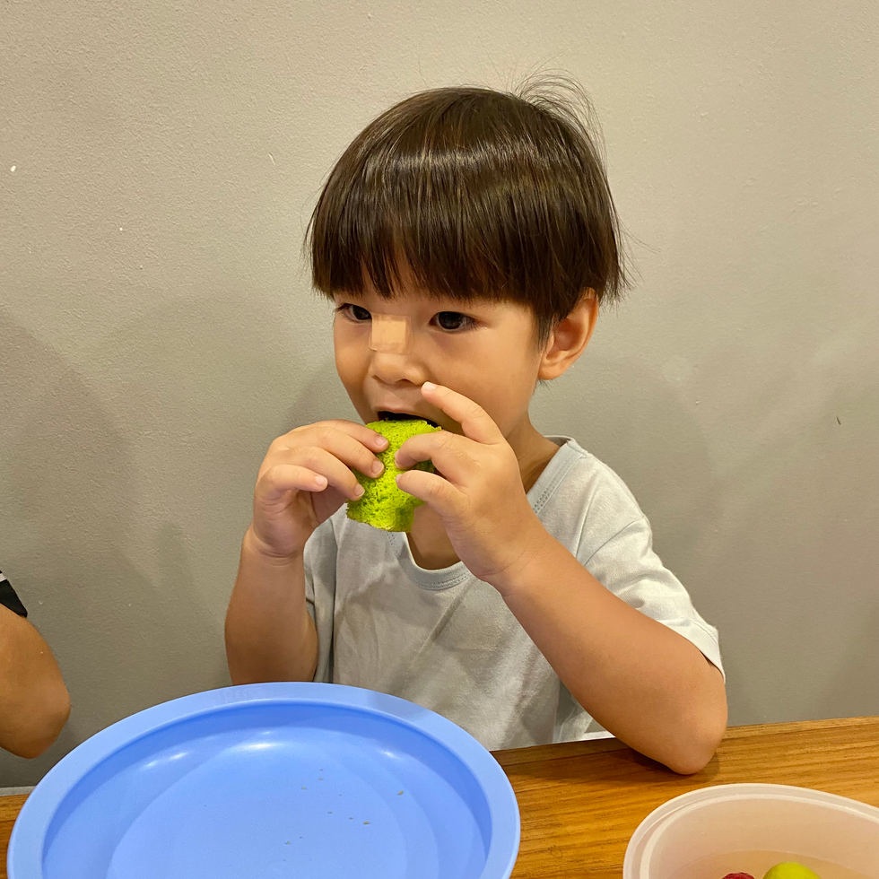 Just look at that face. It is his first time eating Pandan Cake and the rate at which he wolfed it down, there is no doubt he's a Pandan Cake lover. It was supposed to be a slice only but he asked for seconds. We gave in. haha
